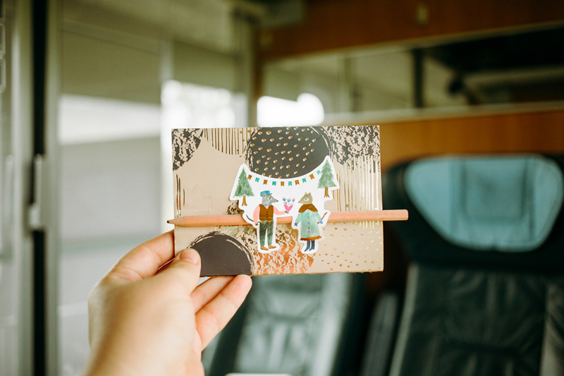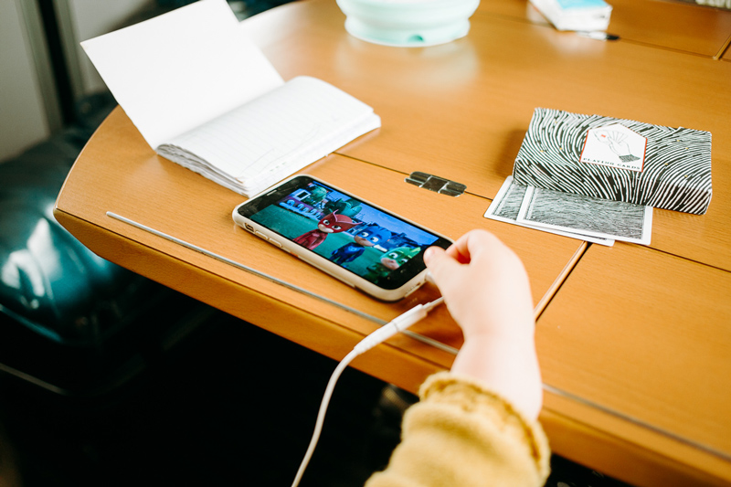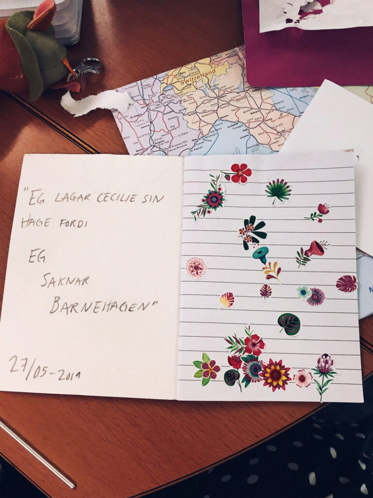 Kva gjorde me i sju timar, spør du kanskje? Jo, me åt mat. Snacks. Spelte kort. Edda sov. Jostein las. Saga såg på barne-tv på telefonen min. Me laga klistermerkehistoriar, det er ein ting me har gjort lenge når me er på reis, for å begrensa mengden skjerm i løpet av ein reisedag. Eg kjøper klistermerker og ei ny lita notatbok, også klistrar me inn i boka og skriv ei historie med det. Denne handla om to kaniner som skulle få foreldrene sine på besøk. Veldig koselig aktivitet! Og perfekt suvenir frå turen.