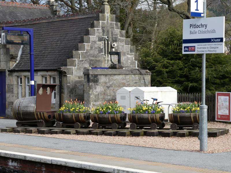 Pitlochry er et lite idyllisk sted (ca. 2800 innbyggere) mellom Edinburgh og Inverness. Også denne stasjonen har et “blomstertog” – som er laget av whiskyfat.