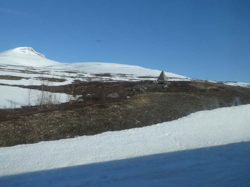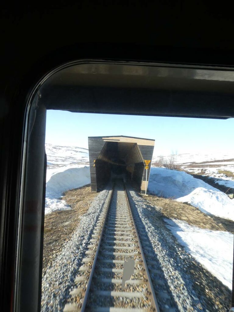 Da vi reiste hjemmefra, lå det ennå snø på gårdsplassen. Vi var derfor spente på hvor mye som hadde tinet mens vi var borte. Som du ser på bildet, var det fortsatt rikelig med snø på Saltfjellet. Prøv å forestille deg en snøstorm om vinteren, og du forstår hvorfor det finnes snøoverbygg på utsatte deler av strekningen.